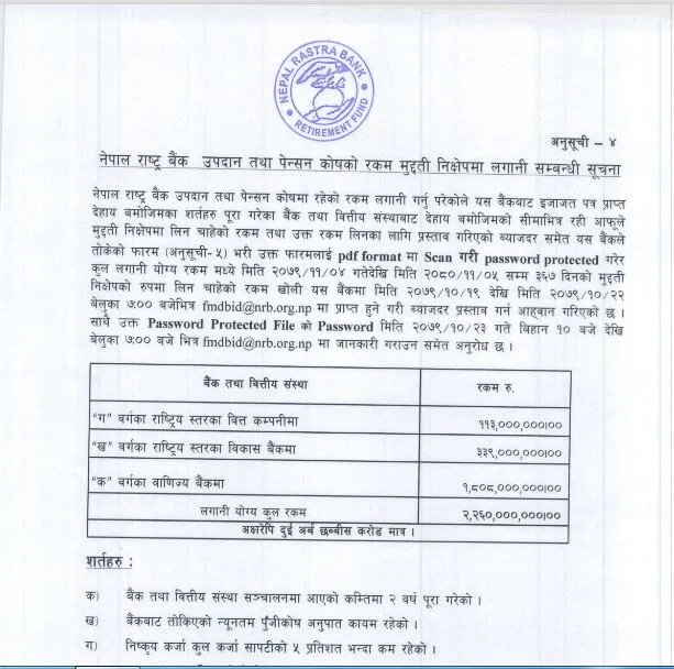 नेपाल राष्ट्र बैकले दुई अर्ब २६ करोड रुपैयाँ संस्थागत निक्षेप लगानीको लागि प्रस्ताव आव्हान गरेको छ । राष्ट्र बैंकले बिहीबार उपदान तथा पेन्सन कोषमा रहेको रकम तीन सय ६७ दिने मुद्धती निक्षेपकोरुपमा २०७९ फागुन चार गतेदेखि २०८० फागुन पाँच गतेसम्म लगानी गर्नको लागि बैंक तथा फाईनान्स कम्पनीहरुसँग प्रस्ताव माग गरेको हो ।