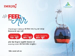 आइएमई पे र चन्द्रागिरि हिल्सवीच फील द एयर नामक अफर सार्वजनिक गरिएको छ । अफर अनुसार आइएमई पे वालेट एप प्रयोगकर्ताहरूले चन्द्रागिरि केबलकारको टिकट आइएमई पे एप मार्फत काट्नु भए चन्द्रागिरि हिल्समा रहेको विभिन्न राइड्सहरुमा छुटहरु प्राप्त गर्न सक्ने छन् ।