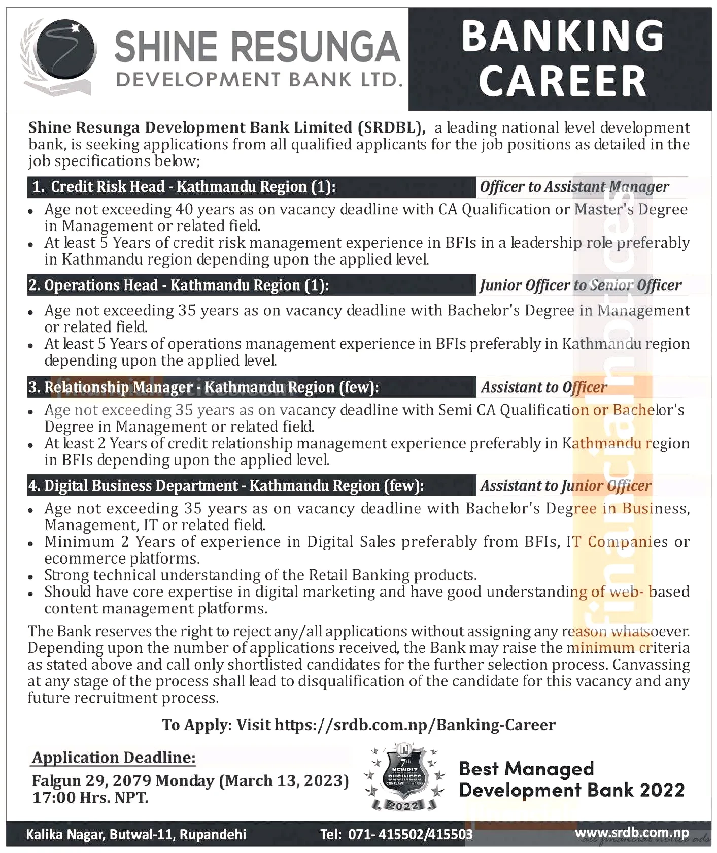 शाइन रेसुङ्गा डेभलपमेन्ट बैंकले विभिन्न पदका लागि कर्मचारी माग गरेको छ ।