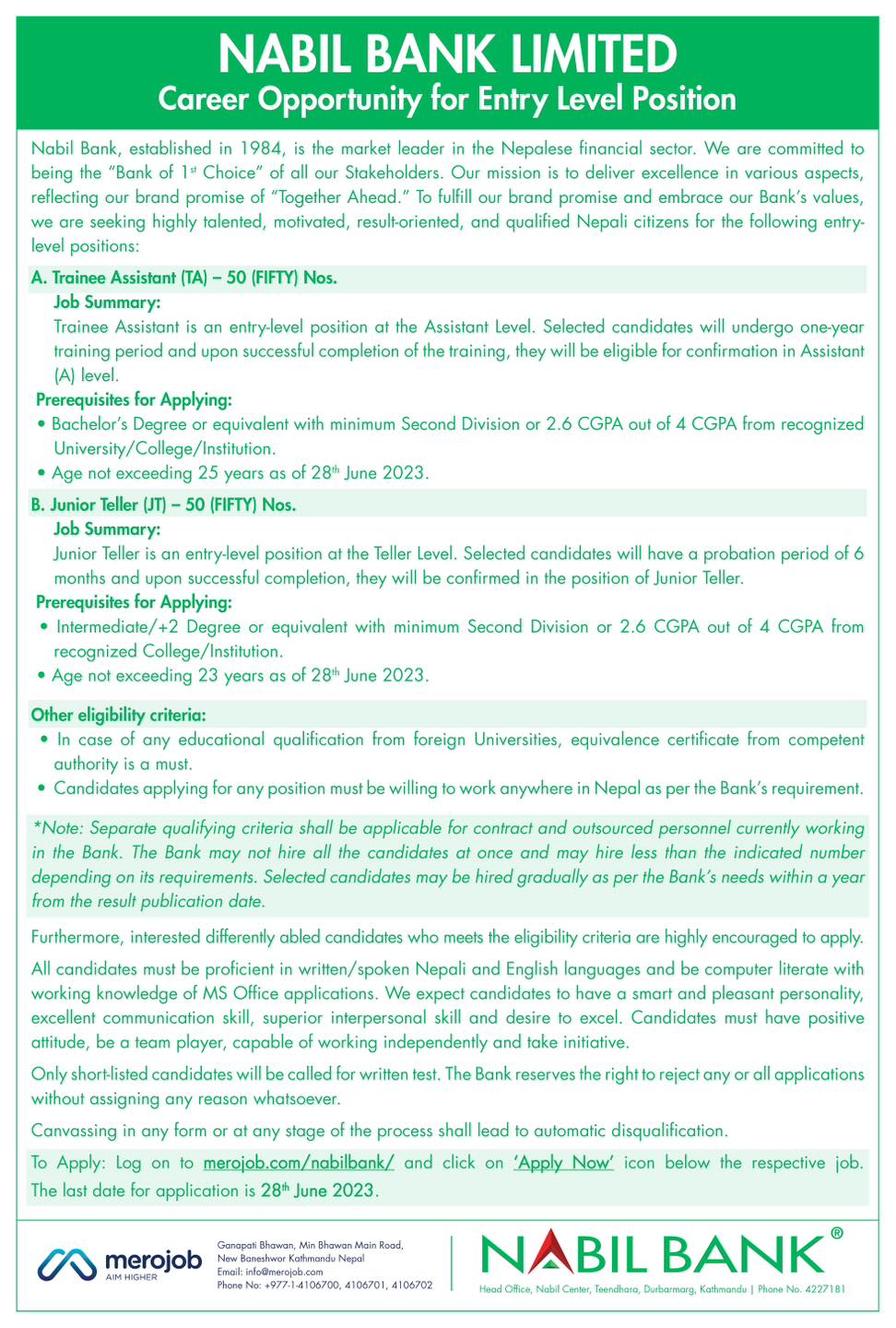 इच्छुक उम्मेदवारले मेरो जव https://merojob.com/trainee-assistant-86/ र नबिल बैंकको https://www.nabilbank.com/individual वेवसाइट मार्फत आवेदन दिन सक्ने बैंकले जनाएको छ ।