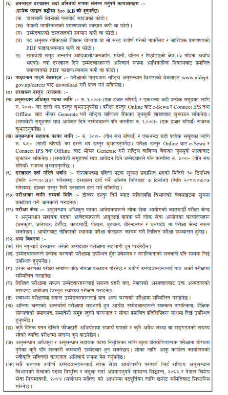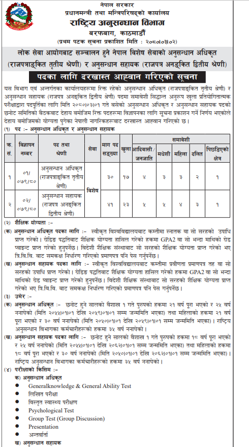 विभागले ३० जना अनुसन्धान अधिकृत र ४१ जना अनुसन्धान सहायक माग गरेको हो। अनुसन्धान अधिकृतका लागि कम्तीमा स्नातक वा सो सरह उत्तीर्ण भएको हुपर्नेछ। ग्रेडिङ पद्धतिबाट शैक्षिक योग्याता हासिल गरेकाले जीपीए २ वा सोभन्दा माथि ग्रेड प्वइन्ट प्राप्त गरेको हुनुपर्ने जनाइएको छ।