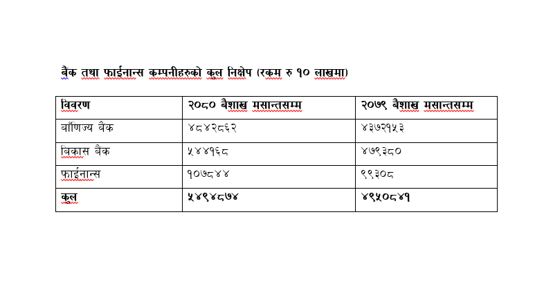 चालु आवको बैशाख मसान्तसम्ममा बाँणिज्य बैंकहरुले मात्र भने कुल ४८ खर्ब ४२ अर्ब ८६ करोड २० लाख रुपैंयाँ निक्षेप संकलन गरेका छन् । यो निक्षेप गत आवको सोही अवधिको तुलनामा चार खर्ब ७० अर्ब तीन करोड ३० लाख रुपैंयाँले बढी हो । गत आवको सोही अवधिमा बाँणिज्य बैंकहरुको यस्तो निक्षेप रकम ४३ खर्ब ७२ अर्ब १५ करोड १३ लाख रुपैंयाँ रहेको थियो । यसैगरी बिकास बैंकहरुले पनि चालु आवको १० महिनाको अवधिमा पाँच खर्ब ४४ अर्ब १६ करोड ८० लाख रुपैंयाँ निक्षेप संकलन गरेका छन् ।