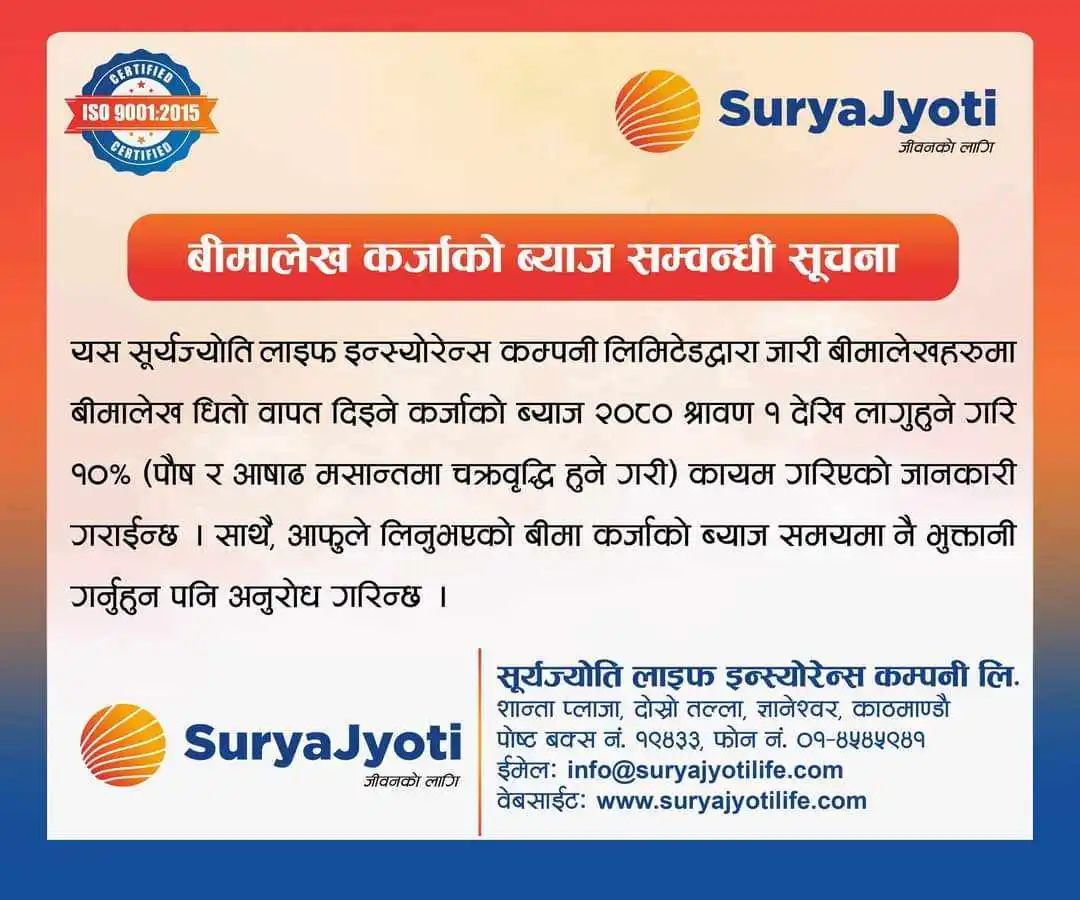 सूर्यज्योति लाइफद्वारा बीमालेख धितो कर्जाको ब्याजदर परिवर्तन