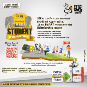 रिद्धि सिद्धि सिमेन्ट लि.ले यस वर्ष देखि आफ्नो व्यवसायिक सामाजिक उत्तरदायित्व अन्तर्गत मकवानपूर जिल्लालाई लक्षित गरि ‘ मकवानपूर स्मार्ट स्टूडेण्ट अफ द इएर २०८०’ को छात्रवृत्ति कार्यक्रम ल्याएको छ ।