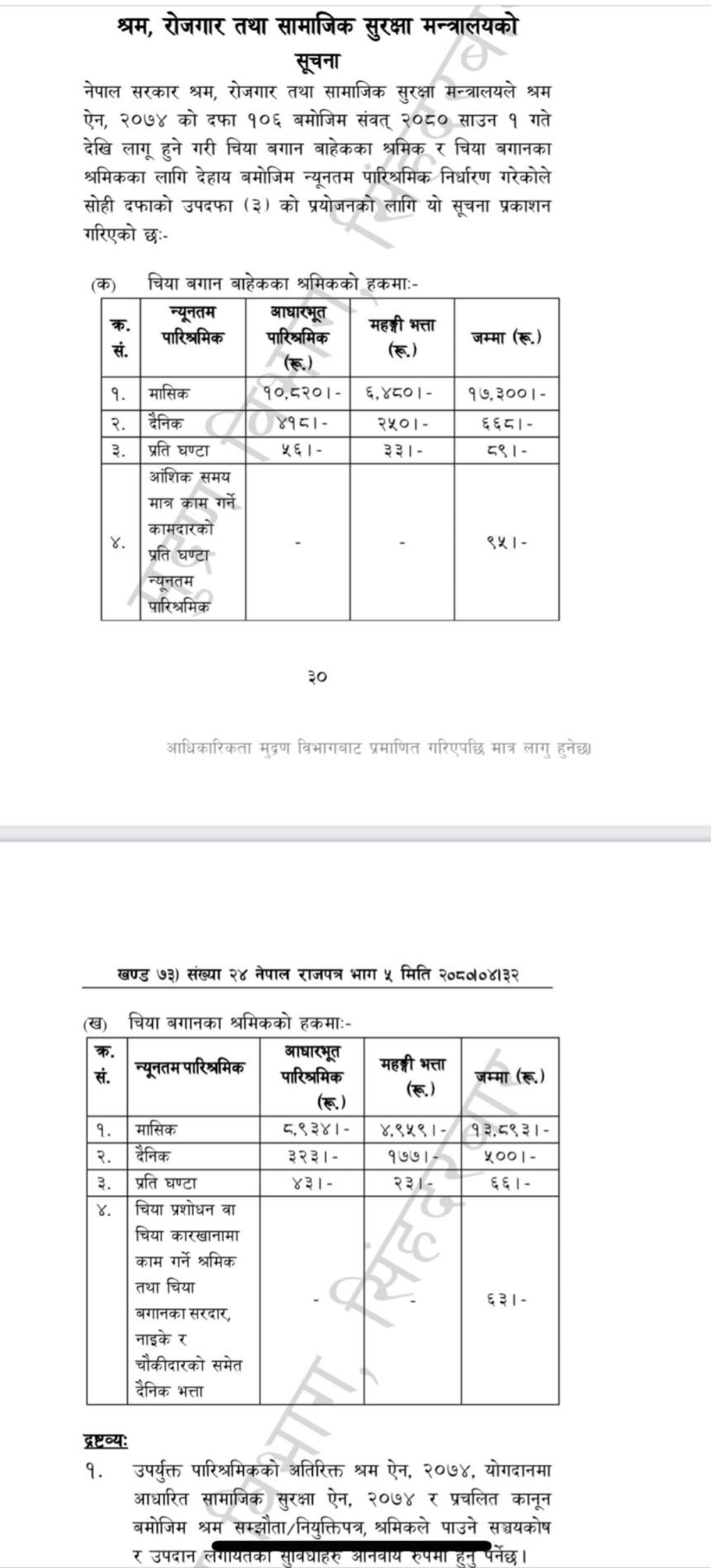 श्रम ऐन, २०७४ को दफा १०६ बमोजिम श्रमिकको मासिक पारिश्रमिक १७ हजार ३ सय रुपैयाँ पुर्याइएको हो । आंशिक समय मात्र काम गर्ने श्रमिकले प्रतिघण्टा न्यूनतम ९५ रुपैयाँ पाउने छन् । वृद्धि गरिएको पारिश्रमिकमा चिया बगान बाहेकका श्रमिकको मासिक आधारभूत १० हजार ८२०, महँगी भत्ता ६ हजार ४८० गरी १७ हजार ३०० पुर्याइएको छ ।