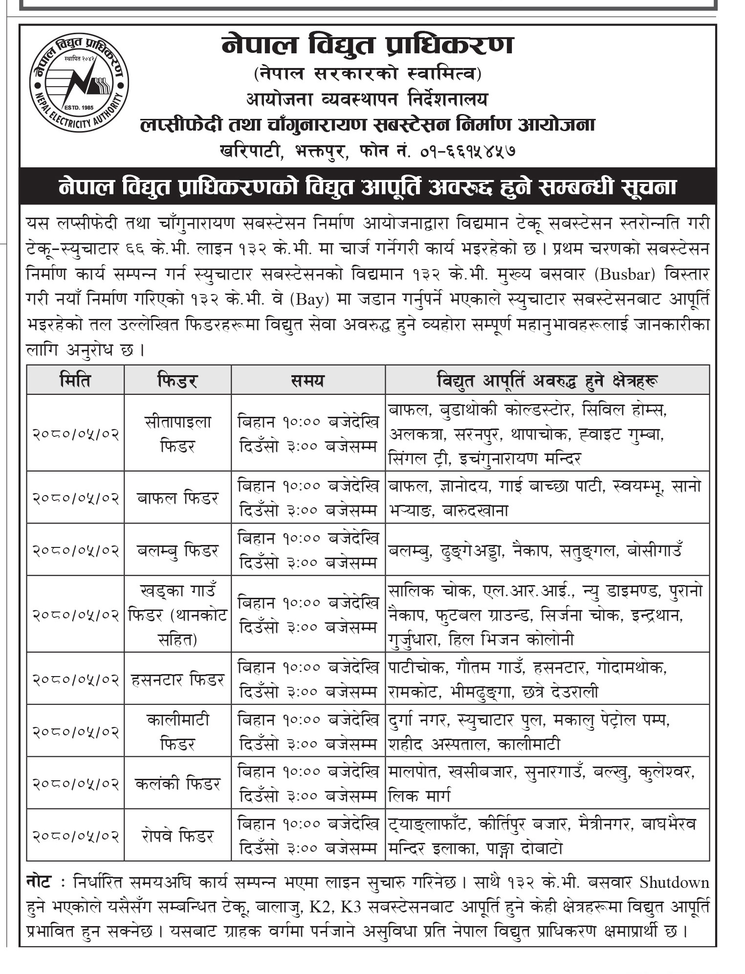 नेपाल विद्युत् प्राधिकरणका अनुसार बिहान १० बजेदेखि दिउँसो ३ बजेसम्म विद्युत् सेवा अवरुद्ध हुने छ । निर्धारित समयअघि काम सम्पन्न सकिए विद्युत् सेवा अगावै सञ्चालनमा आउने छ पनि प्राधिकरणले जानकारी गराएको छ ।