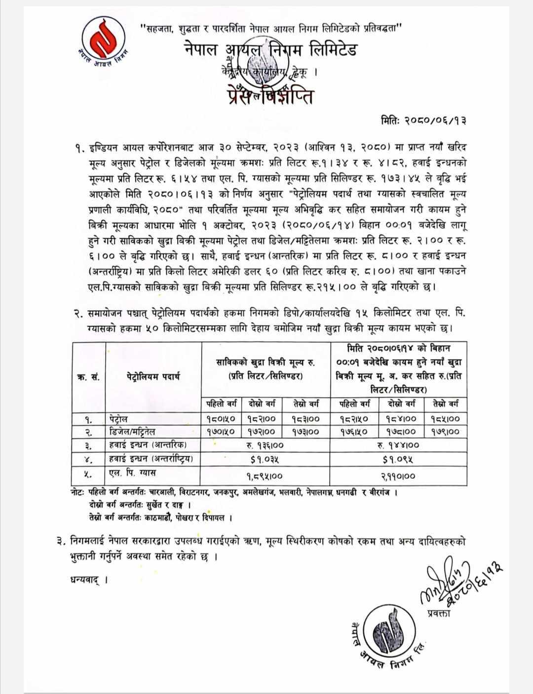 यस्तो छ निगमको विज्ञप्तिः