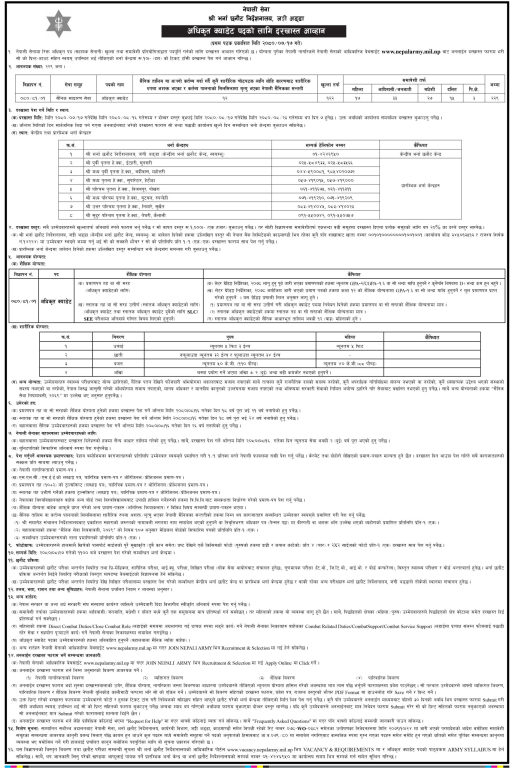 नेपाली सेनामा रिक्त २२९ अधिकृत पद (सहायक सेनानी) खुला तथा समावेशी प्रतियोगिताद्वारा पदपूर्ति गर्नको आवेदन माग गरिएको सेनाले जनाएको छ । आज शुक्रबारदेखि मंसिर २३ गतेसम्म र दोब्बर दस्तुर बुझाई थप एक हप्तासम्म आवेदन दिन सकिने छ ।