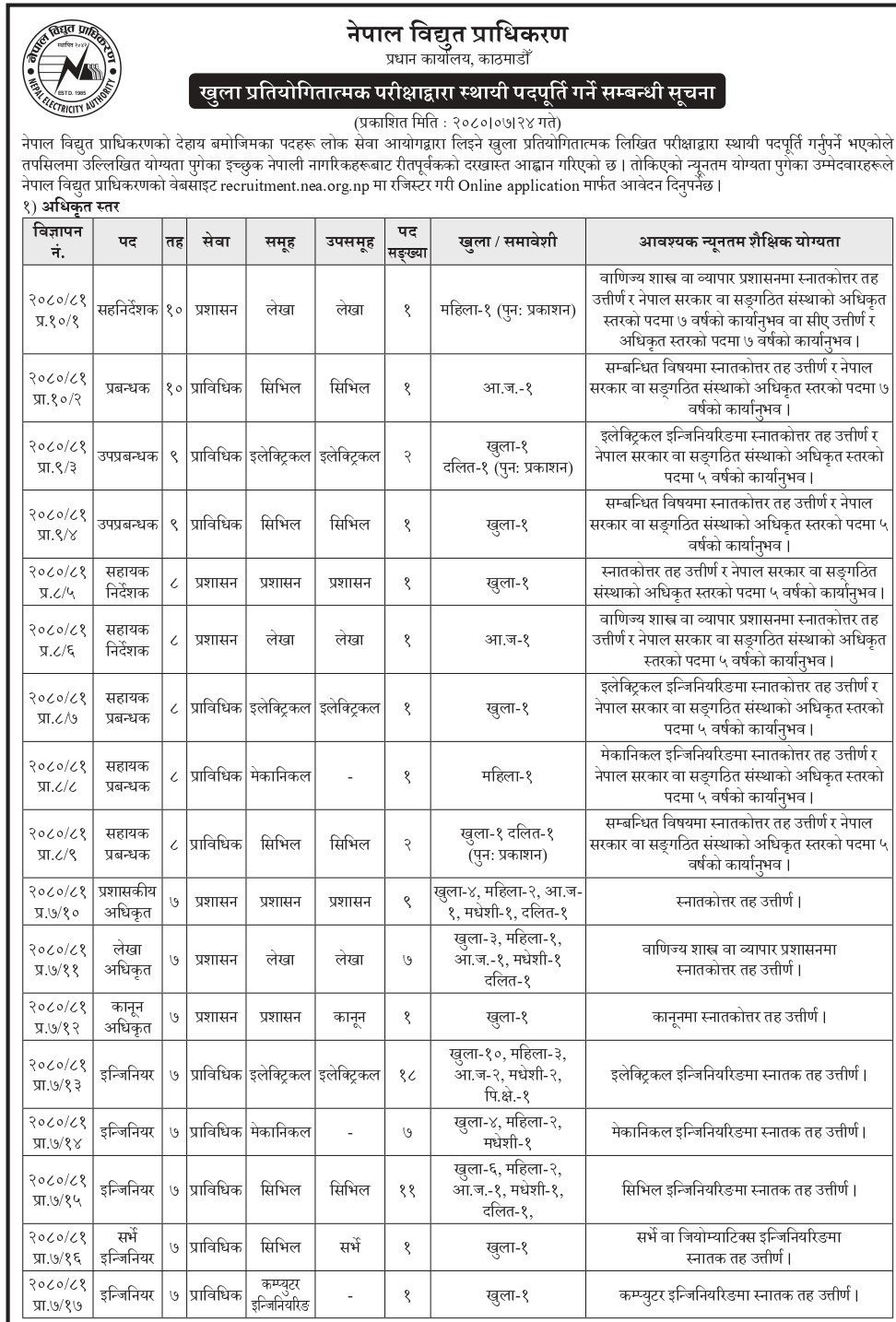 नेपाल विद्युत् प्राधिकरणले सहनिर्देशकदेखि प्राविधिकसम्म झन्डै ४ सय कर्मचारी मागेको छ । शुक्रबार सूचना प्रकाशन गर्दै प्राधिकरणले दसौँ तहदेखि तेस्रो तहसम्मको प्रशासन र प्राविधितर्फ विभिन्न पदमा आवेदन आह्वान गरेको हो ।