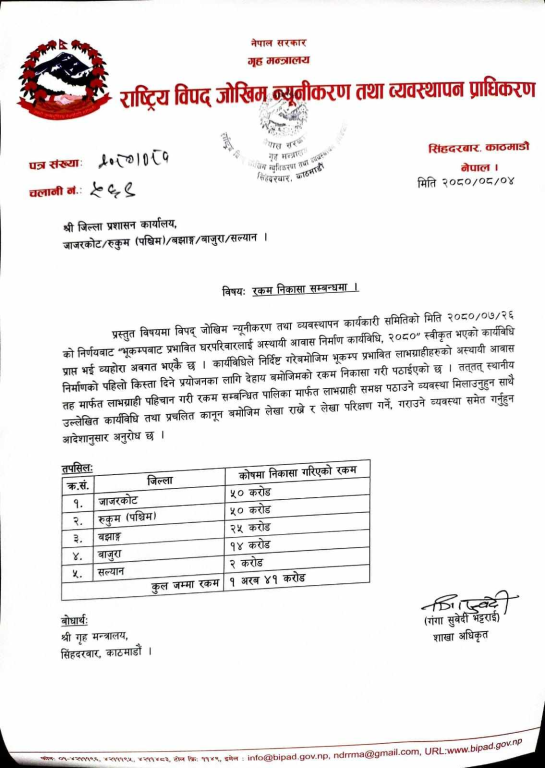 जाजरकोट र पश्चिम रुकुमका लागि ५०–५० करोड, बझाङका लागि २५ करोड, बाजुराका लागि १४ करोड र सल्यानका लागि दुई करोड गरी जम्मा एक अर्ब ४१ करोड निकासा भएको हो । प्राधिकरणले निकासाबारेको बोधार्थ गृह मन्त्रालयमा पठाएको छ ।