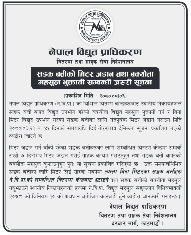 नेपाल विद्युत् प्राधिकरणले सडक बत्तीको मिटर जडान तथा बक्यौता महसुल तत्काल भुक्तानी गर्न निर्देशन दिएको छ ।