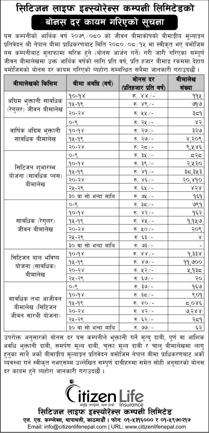 सिटिजन्स लाइफ इन्स्योरेन्सले आर्थिक वर्ष २०७९/८०सम्मको जीवन बीमा कोषको बीमाङ्कीय मूल्याङ्कनका आधारमा नयाँ बोनस दर सार्वजनिक गरेको छ। इन्स्योरेन्सले २ रुपैयाँ बोनस दर बढाएर सार्वजनिक गरेको हो।