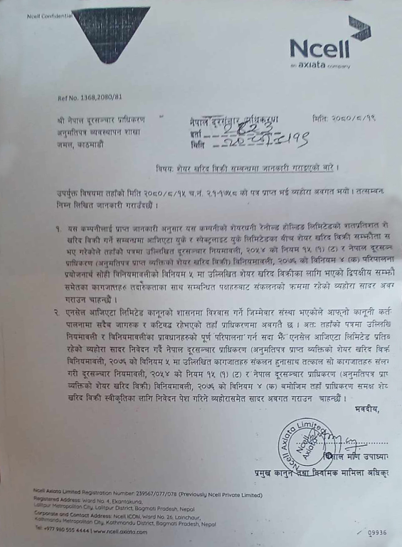 शेयर खरिद बिक्री: के छ एनसेलले प्राधिकरणलाई पठाएको पत्रमा? (पत्रसहित)