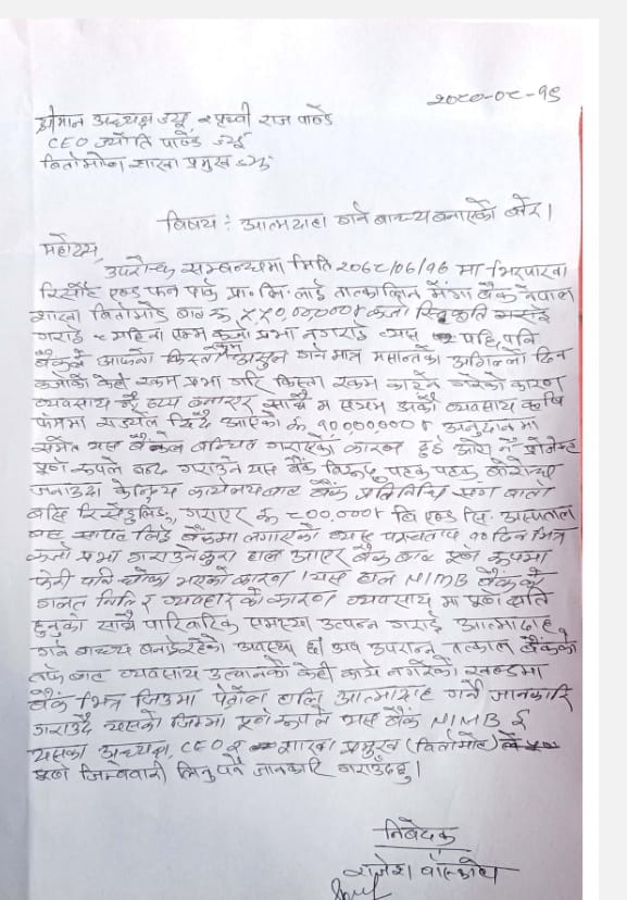 यो चिठी नेपाल इन्भेष्टमेण्ट मेगा बैंकका एक ऋणीले बैंकका संचालक समितिको अध्यक्ष र सिइओलाई लेखेको पत्र हो । बैंकका ऋणी राजेश बाँस्कोटाले यो चिठी लेखेका हुन् । बैंकको ऋणी बाँस्कोटाले आफ्नो सामाजिक संजाल फेसबुक मार्फत पत्र सार्वजनिक गर्दै बैंकका कारण आफुले बैंककै कार्यालयमा आत्मदाह गर्ने चेतावनी दिएका छन्।