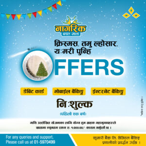 कुमारी बैंक लिमिटेडले आउदै गरेको क्रिस्मस, यःमरि पुन्हि तथा तमु ल्होसारलाई लक्षित गरि नागरिक बचत खातामा आफ्ना ग्राहक महानुभावहरूको सेवा–सुविधालाई मध्यनजर गर्दै चाड पर्वको अवसरमा आर्कषक छुट तथा अफरहरु प्रदान गर्ने निर्णय गरेको छ ।