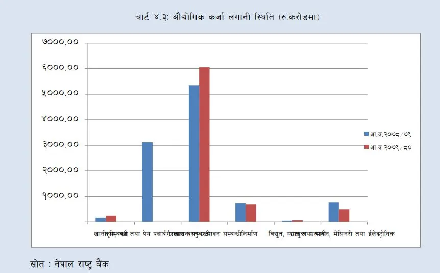 गत आर्थिक वर्षको तुलनामा समीक्षा वर्षमा खानीः धातुको उत्पादनस कृषि, वन तथा पेय पदार्थ उत्पादन, गैरखाद्य वस्तु उत्पादन सम्बन्धी र विद्युत, ग्यास तथा पानी उद्योग तर्फको कर्जामा क्रमशः ४६ दशमलव ७४ प्रतिशत, आठ दशमलव ८१ प्रतिशत, १३ दशमलव १३ प्रतिशत र ३० दशमलव चार प्रतिशतले बृद्धि भएको छ भने निर्माण र धातुका उत्पादन, मेशनरी तथा ईलेक्ट्रोनिक्स उद्योग तर्फको कर्जामा क्रमशः छ दशमलव एक प्रतिशत र ३६ दशमलव सात प्रतिशतले कमी आएको प्रतिवेदनमा उल्लेख छ ।
