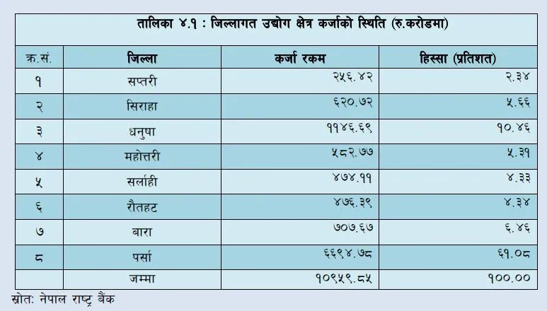गत आर्थिक वर्षमा यस्तो कर्जा एक खर्ब दुई अर्ब १३ करोड रुपैयाँ रहेको थियो । समीक्षा वर्षमा मधेश प्रदेशमा औद्योगिक क्षेत्रमा प्रवाहित कर्जा मध्ये सबैभन्दा बढी कर्जा पर्सा जिल्लामा ६१ दशमलव आठ प्रतिशत र सबै भन्दा कम सप्तरी जिल्लामा दुई दशमलव ३४ प्रतिशत रहेको छ । मधेश प्रदेशमा सब भन्दा धेरै उद्योगहरू पर्सा जिल्लामा रहेकोले पर्सा जिल्लामा सबैभन्दा बढी औद्योगिक कर्जा प्रवाह छ ।