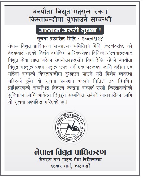 ‘विगतदेखि रहेको बक्यौता विद्युत महसुल रकम असुल उपर गर्न एक पटकका लागि बढीमा ६० महिना सम्मको किस्ताबन्दीमा बुझाउन पाउने गरी विशेष व्यवस्था गरिएको हुँदा यो सूचना प्रकाशन भएको मितिले ३० दिनभित्र प्राधिकरणको सम्बन्धित वितरण केन्द्रमा सम्पर्क राखी किस्ताबन्दीको सुविधाका लागि आवेदन दिनुहुन सम्बन्धित सबैको जानकारीका लागि यो सूचना प्रकाशित गरिएको छ,’ प्राधिकरणले भनेको छ ।