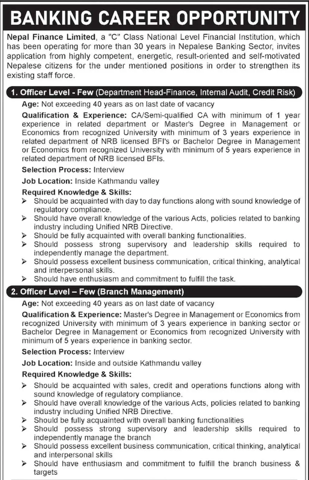 नेपाल फाइनान्स कम्पनी लिमिटेडले विभिन्न पदका लागि कर्मचारी माग गरेको छ ।