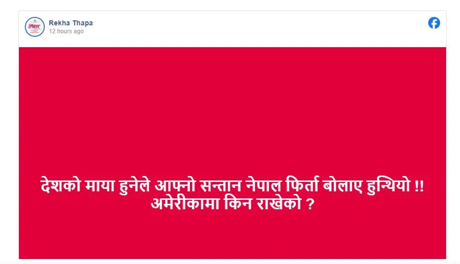 उनले फेसबुकमा लिङदेनको नाम उल्लेख नगरी लेखेकी छन्, ‘देशको माया हुनेले आफ्नो सन्तान नेपाल फिर्ता बोलाए हुन्थ्यो! अमेरिकामा किन राखेको?’