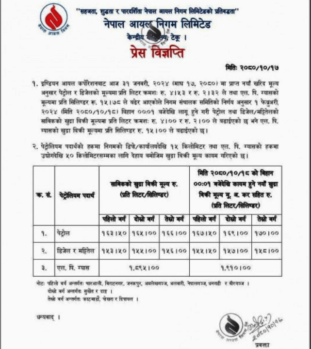 नयाँ मूल्यसूची बुधबार राति १२ बजेदेखि लागू भएको हो।