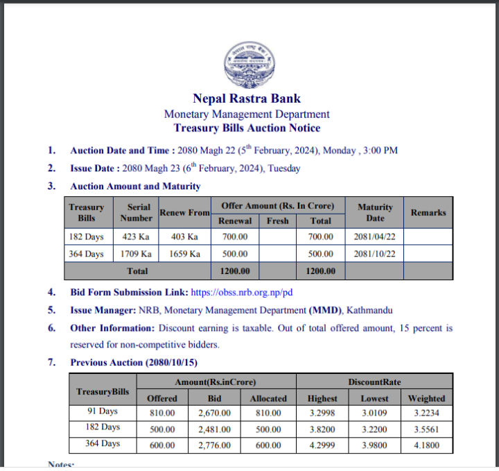 जारी मिती माघ २३ गते मंगलबार तोकिएको टे«जरी बिल खरिदको लागि वाणिज्य बैंक, विकास बैंक र फाइनान्स कम्पनीहरुले बोलकबोल पेस गर्न सक्ने छन् । यसरी बिक्री गरिने कुुल ट्रेजरी बिल मध्येमा एक सय ८२ दिने अवधिको सात अर्ब र तीन सय ६४ दिने अवधिको पाँच अर्ब रुपैयाँको रहेको छ । यि ट्रेजरीहरुको परिपक्व हुने अवधि भने क्रमशः २०८१ साउन २२ गते र २०८१ माघ २२ गते तोकिएका छन् ।