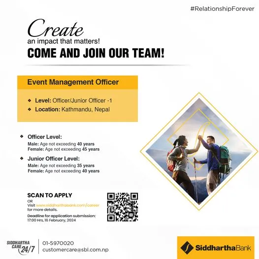 सिद्धार्थ बैंकले कर्मचारी माग गरेको छ । बैंकले इभेन्ट म्यानेजमेन्ट अफिसरमा अफिसर र जूनियर अफिसरका लागि कर्मचारी माग गरेको हो ।