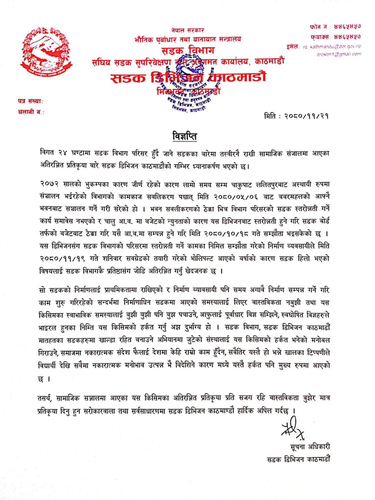 आइतबारको वर्षाका कारण विभागको कार्यालय परिसर भित्रैको सडक हिलाम्मे भएको तस्बिर सामाजिक सञ्जालमा भाइरल भएपछि असन्तुष्टि जनाउँदै कार्यालयले वास्तविकता नबुझी स्वघोषित विज्ञ नबन्न चेतावनी दिएको छ । ‘विगत २४ घण्टामा सडक विभाग परिसर हुँदै जाने सडकका बारेमा तस्बिर नै राखी सामाजिक सञ्जालमा आएका अतिरञ्जित प्रतिक्रिया बारे सडक डिभिजन काठमाडौँको गम्भीर ध्यानाकर्षण भएको छ’, कार्यालयले सोमबार जारी गरेको विज्ञप्तिमा भनिएको छ, ‘सो सडकको निर्माणलाई प्राथमिकतामा राखिएको र निर्माण व्यवसायी पनि समय अगावै निर्माण सम्पन्न गर्ने गरी काम सुरु गरिरहेको सन्दर्भमा निर्माणाधीन सडकमा आएको समस्यालाई लिएर वास्तविकता नबुझी तथा यस किसिमका स्वाभाविक समस्यालाई बुझी बुझी पनि बुझ पचाउने, आफूलाई पूर्वाधार विज्ञ सम्झिने, स्वघोषित विज्ञहरूले भाइरल हुनका निम्ति यस किसिमको हर्कत गर्नु अझ दुर्भाग्य हो ।’