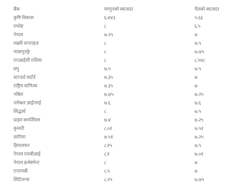 हाल सञ्चालनमा रहेका २० वाणिज्य बैंकहरूले सार्वजनिक गरेको आगामी महिनाका लागि पछिल्लो महिनाको मसान्त भित्र प्रस्तावित ब्याजदर अनुसार १७ वटा बैंकहरूले ब्याजदर घटाएर सार्वजनिक गरेको छ । एक बैंकले ब्याजदर बढाएको छ भने दुई बैंकले फागुन कै ब्याजदर काया गर्ने भएको हो ।