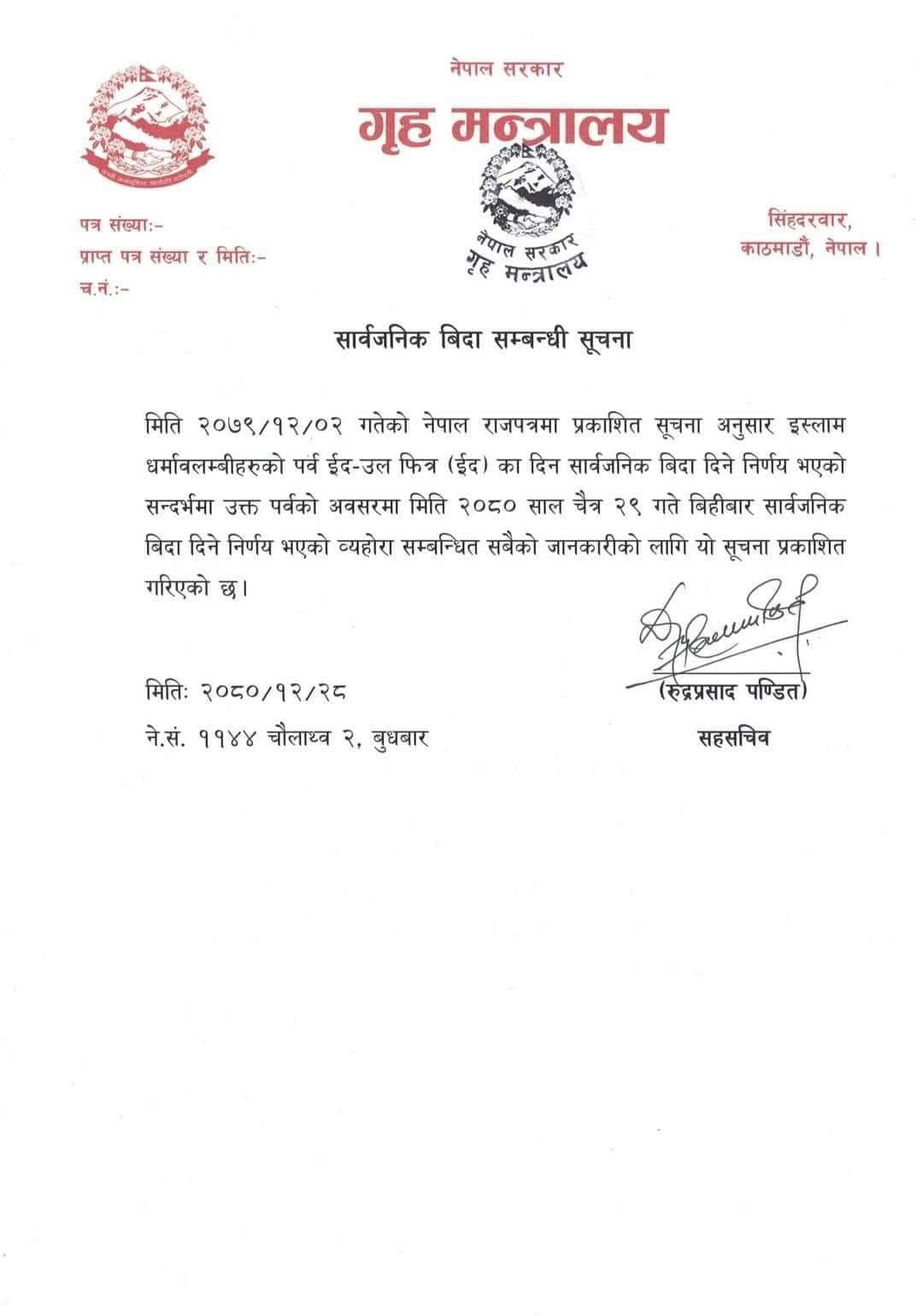 भोलि चैत २९ गते बिहीबार ईदको अवसरमा सरकारले सार्वजनिक बिदा दिएको गृह मन्त्रालयले जानकारी दिएको छ । गत वर्ष चैत २ गते प्रकाशित राजपत्रको सूचना अनुसार नै बिदा दिइएको मन्त्रालयले जनाएको छ ।