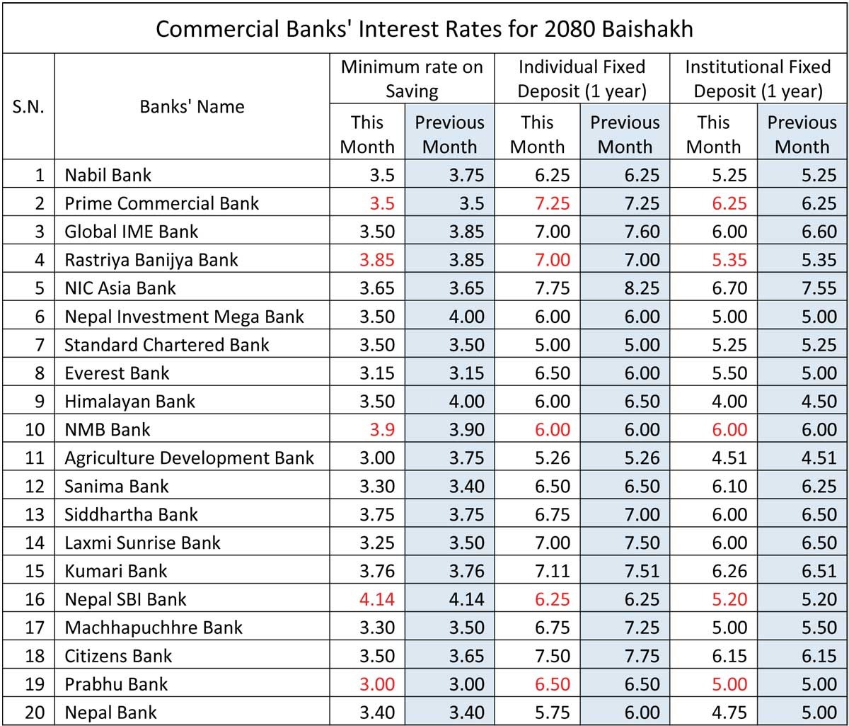 चैतको तुलनामा बैशाख महिनामा १३ वटा बैंकले ब्याजदर घटाएका छन् भने ५ ले स्थिर राखेका छन् । दुई बैंकले भने ब्याजदर बढाएका छन् । कृषि विकास, स्टान्डर्ड चार्टर्ड, नबिल, हिमालयन र नेपाल इन्भेस्टमेन्ट मेगा बैंकले व्यक्तिगत मुद्दतिको अधिकतम ब्याजदर बैशाखका लागि स्थिर राखेका छन् ।