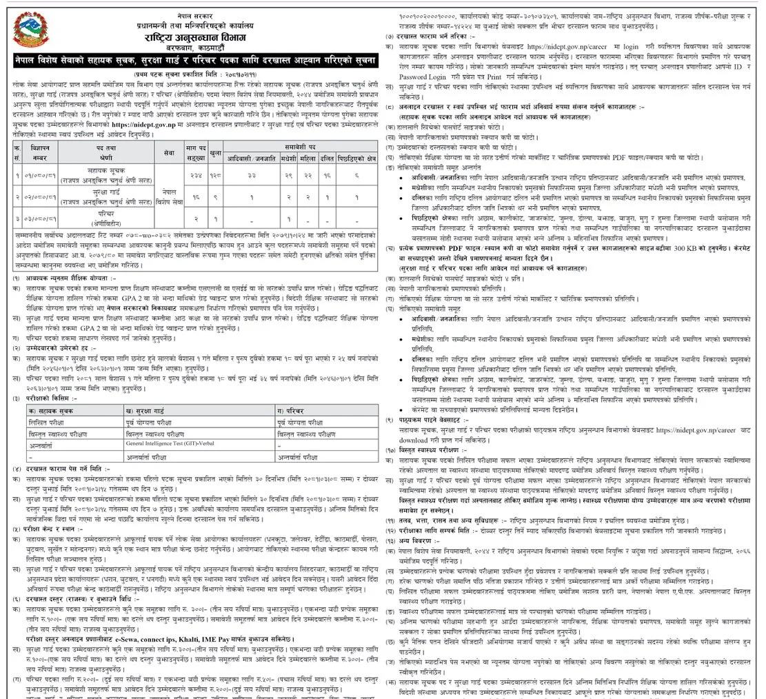 सार्वजनिक सूचना जारी गर्दै विभागले २५२ जना कर्मचारीका लागि दरखास्त आह्वान गरेको हो । विभागले विशेष सेवाको सहायक सूचक पदमा २३४, सुरक्षा गार्डका लागि १६ जना र परिचर पदमा २ जनाका लागि दरखास्त आह्वान गरेको हो ।