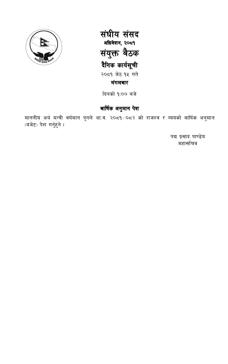 अर्थमन्त्री वर्षमान पुनले बजेट सार्वजनिक गर्नेछन् । यसका लागि सङ्घीय संसद्को संयुक्त बैठक बोलाइएको छ । बैठक दिउँसो १ बजे बस्नेछ ।
