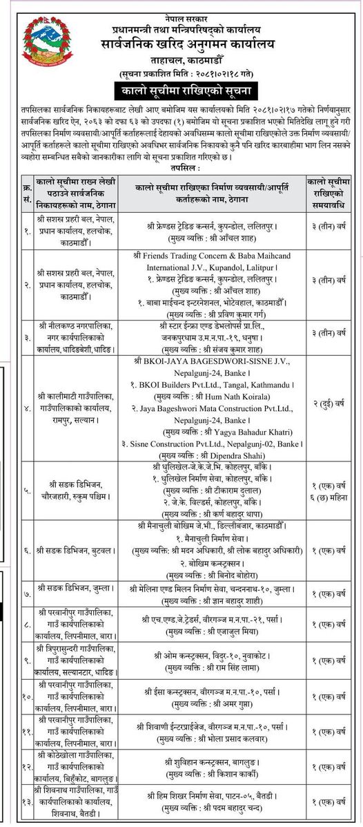 जेठ १७ गतेको निर्णयअनुसार सार्वजनिक खरिद ऐन, २०६३ को दफा ६३ को उपदफा (१) बमोजिम आजबाट लागू हुने गगरी १ देखि ३ वर्षसम्मका लागि निर्माण कम्पनीहरूलाई कालो सूचीमा राखिएको सूचनामा उल्लेख छ ।