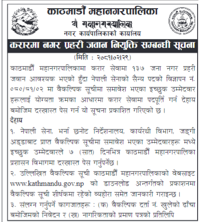 काठमाडौं महानगरपालिकाले करार सेवामा नगर प्रहरी नियुक्तिका लागि दरखास्त आह्वान गरेको छ ।