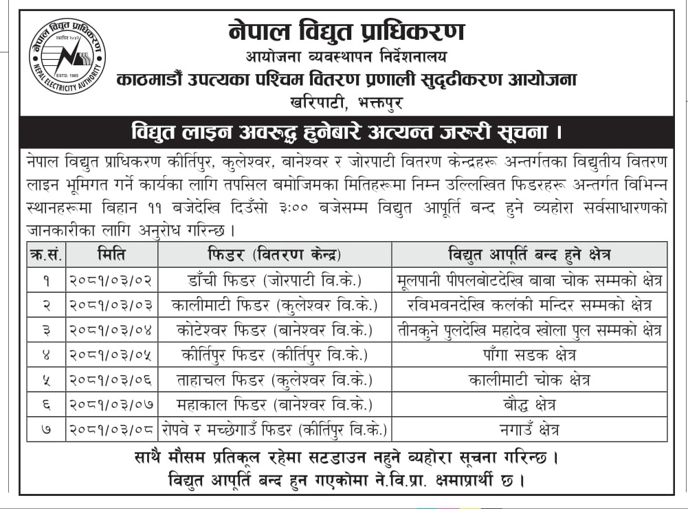 विद्युत् प्राधिकरणअन्तर्गत काठमाडौं उपत्यका पश्चिम वितरण प्रणाली सुदृढीकरण आयोजनाले एक सूचना सार्वजनिक गर्दै काठमाडौंका विभिन्न वितरण केन्द्र अन्तर्गतका विभिन्न स्थानहरूमा दैनिक ४ घन्टा विद्युत अवरुद्ध हुने जानकारी दिएको हो ।