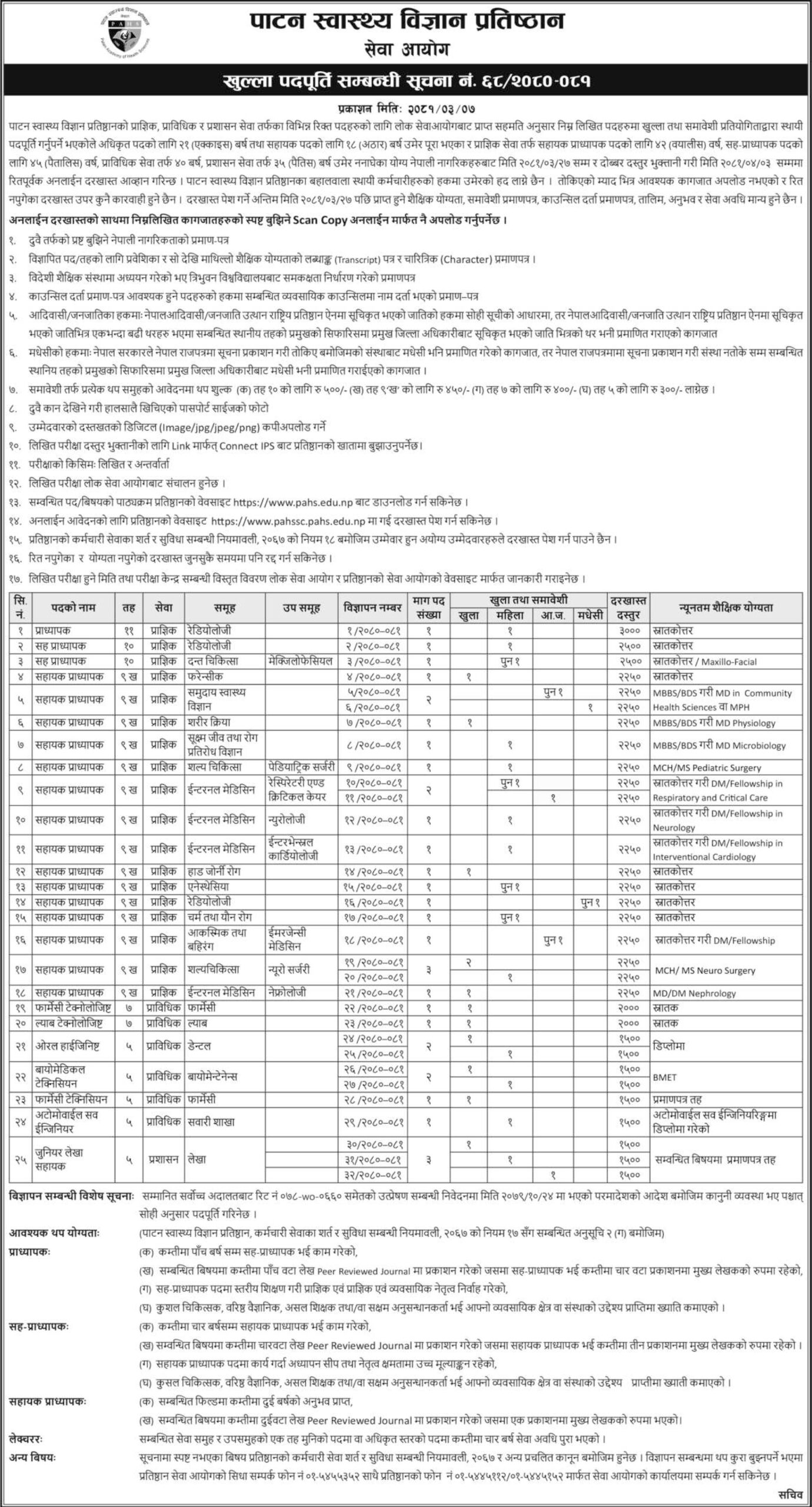 प्रतिष्ठानले प्राध्यापक, सह प्राध्यापक, सहायक प्राध्यापक, फार्मेसी टेक्नोलोजिष्ट, ल्याब टेक्नोलोजिष्ट, ओरल हाईजिनिष्ट, बायोमेडिकल टेक्निसियन, फार्मेसी टेक्निसियन, अटोमोबाइल सबइन्जिनियर र जुनियर लेखा सहायक पदको विभिन्न तह, सेवा, समूह तथा उपसमूहमा ३३ कर्मचारी माग गरेको छ । सूचनाअनुसार यसमा अधिकृतका लागि २१ तथा सहायकको लागि १८ वर्ष उमेर पूरा भएका र प्राज्ञिक सेवातर्फ सहायक प्राध्यापकका लागि ४२, सह प्राध्यापकका लागि ४५ वर्ष, प्राविधिक सेवातर्फ ४०, प्रशासनतर्फ ३५ वर्ष उमेर ननाघेका योग्य नेपाली नागरिकले आवेदन दिन सक्नेछन् ।