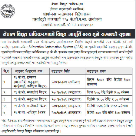 मर्स्याङ्दी काठमाडौँ २२० केभी आयोजनाबाट निर्माण भएको मातातीर्थ २२० केभीको नयाँ कन्ट्रोल रुममा जडित शवस्टेशन अटोमेशन सिस्टमलाई सटडाउनमा राखी कार्य गर्नुपर्ने भएकोले मातातीर्थ सबस्टेसनबाट आपूर्ति भइरहेको स्थानमा विद्युत् आवागमन प्रभावित हुने भएको हो ।