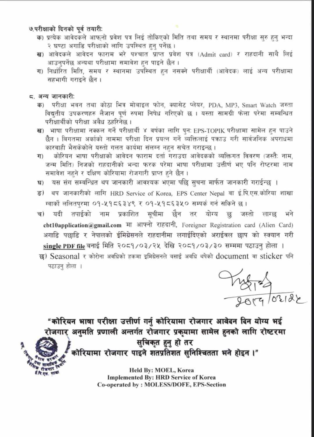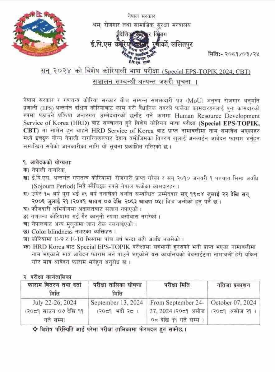 रोजगार अनुमति प्रणाली ईपीएसमार्फत कोरिया जानेहरूको भाषा परीक्षा असोजमा हुने भएको छ । ईपीएस कोरिया शाखाले जारी गरेको सूचनाअनुसार परीक्षा असोज ८ गतेदेखि ११ गतेसम्म हुनेछ ।