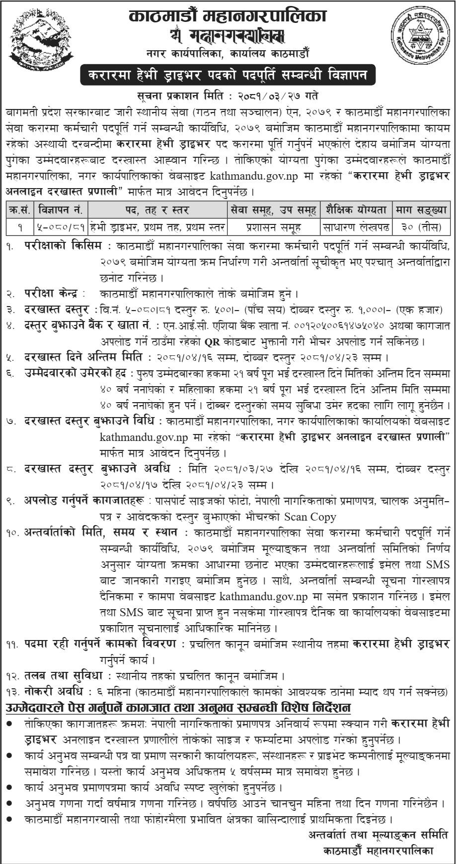 काठमाडौं महानगरपालिकाले करारमा ३० जना हेभी चालकका लागि आवेदन खुलाएको छ।