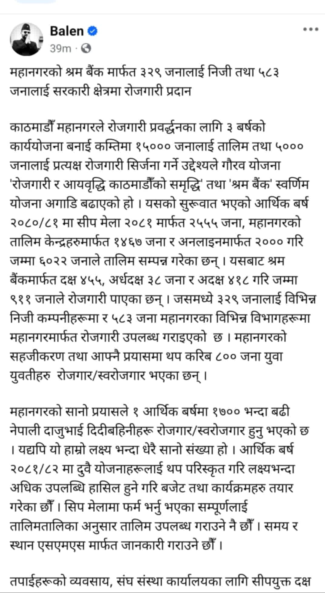 ‘काठमाडौं महानगरले रोजगारी प्रवर्द्धनका लागि तीन वर्षको कार्ययोजना बनाइ कम्तिमा १५ हजार जनालाई तालिम तथा पाँच हजार जनालाई प्रत्यक्ष रोजगारी सिर्जना गर्ने उद्देश्यले गौरव योजना ‘रोजगारी र आयवृद्धि काठमाडौंको समृद्धि’ तथा ‘श्रम बैंक’ स्वर्णिम योजना अगाडि बढाएको हो,’ मेयर बालेनले भनेका छन्। त्यस्तै मेयर बालेनले यसअघि काठमाडौं महानगरपालिकाले सञ्चालन गरेको सीप मेलामार्फत् दुई हजार ५५५ जना, महानगरको तालिम केन्द्रहरूमार्फत एक हजार ४६७ जना र अनलाइनमार्फत दुई हजार गरि जम्मा ६ हजार २२ जनाले तालिम सम्पन्न गरेको बताएका छन्।