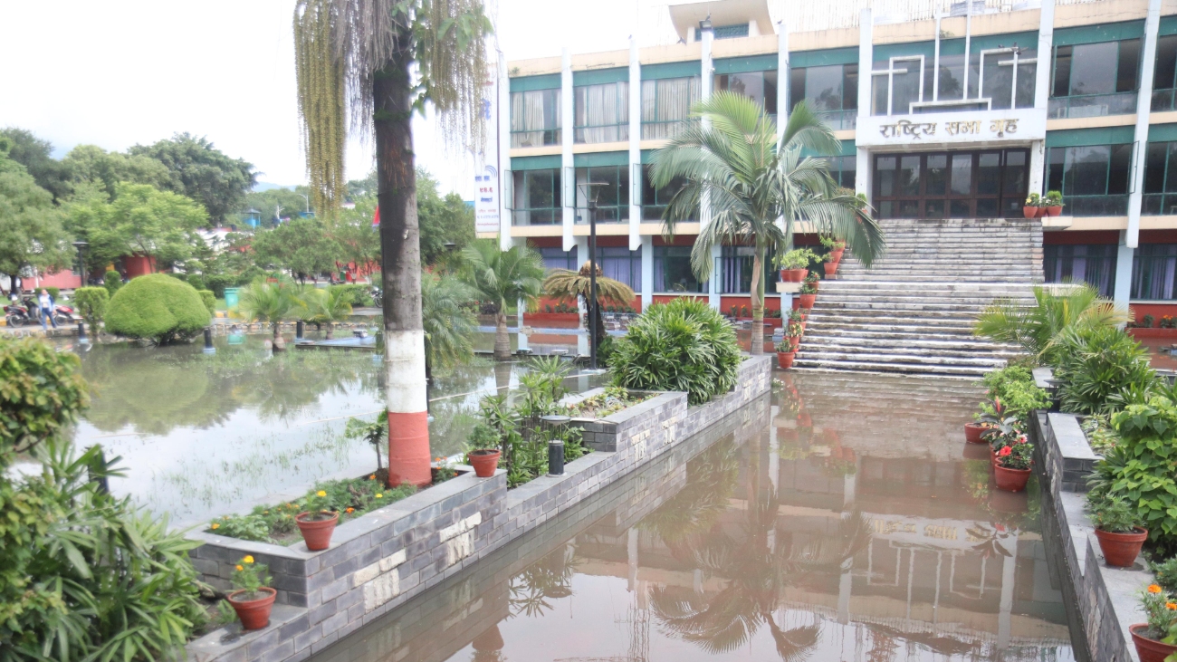 काठमाडौंको प्रदर्शनीमार्गस्थित राष्ट्रिय सभा परिसर जलमग्न बनेको छ।