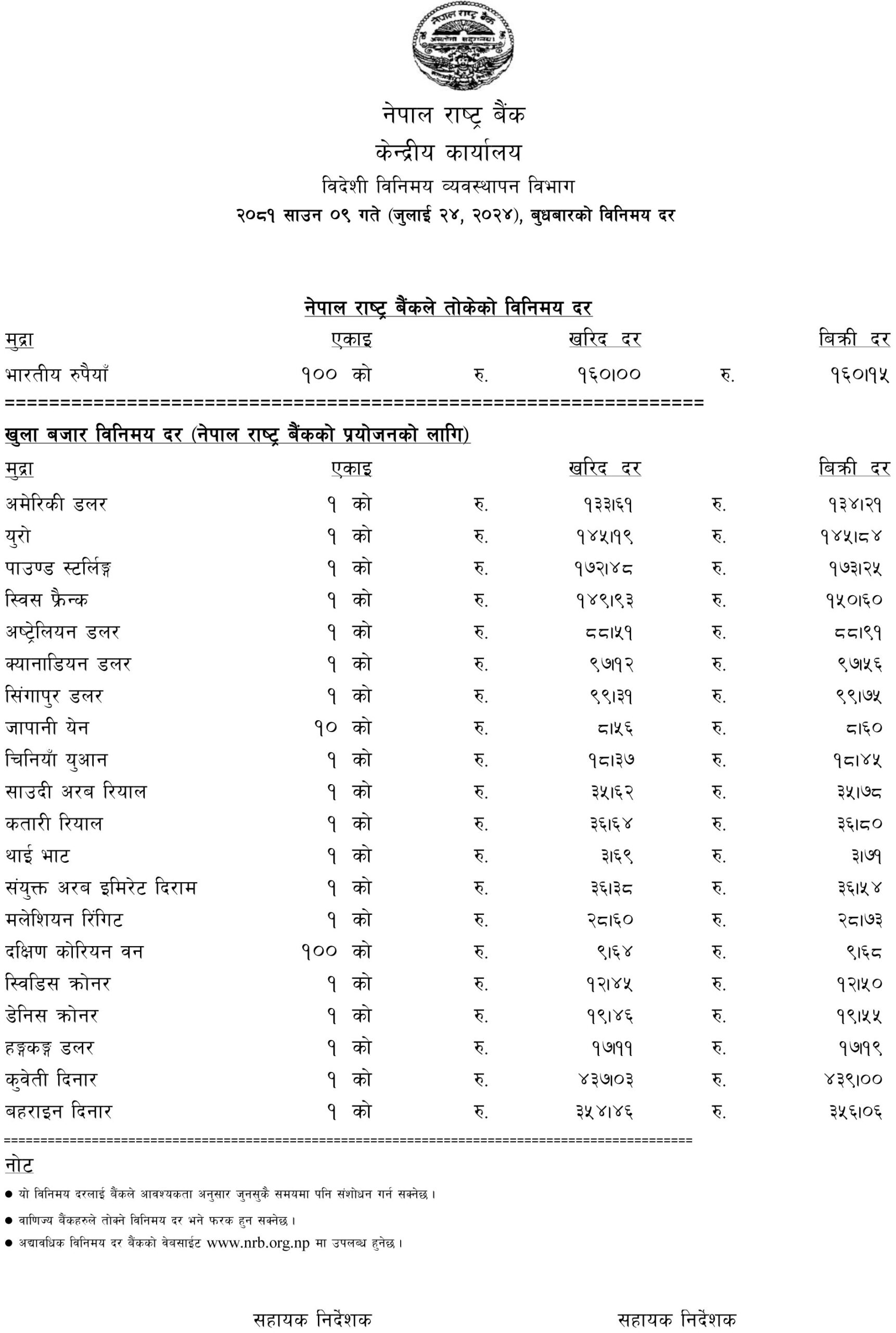 आज अमेरिकी डलर १ को खरिद दर १३३.६१ रुपियाँ र बिक्री दर १३४.२१ रुपियाँ छ । हिजो भने खरिद १३३.५६ रुपियाँ र बिक्री १३४.१६ रुपियाँ थियो । त्यस्तै यसदिन अस्ट्रेलियन डलर १ को खरिद मूल्य ८८.५१ रुपियाँ र बिक्री ८८.९१ रुपियाँ रहेकामा अघिल्लो कारोबार दिन खरिद ८८.९६ रुपियाँ रबिक्री ८९.३६ रुपियाँ थियो ।
