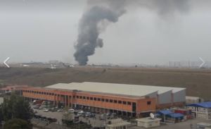 विमानमा आगलागी भइ धुवाँ उडिरहेको छ। सुरक्षाकर्मी र विमानस्थलका अग्निनियन्त्रकहरू आगो निभाउन लागि परेका छन्। यात्रु्को अवस्था अज्ञात छ।