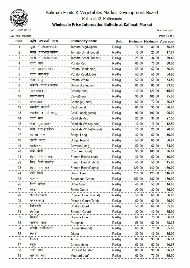 यस्तो छ आजको तरकारी तथा फलफूलको मूल्यसूची