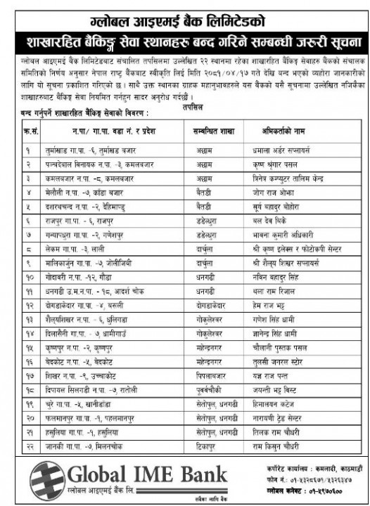ग्लोबल आइएमई बैंकले विभिन्न स्थानमा सञ्चालन भइरहेका शाखारहित बैंकिङ्ग सेवा बन्द गरेको छ ।