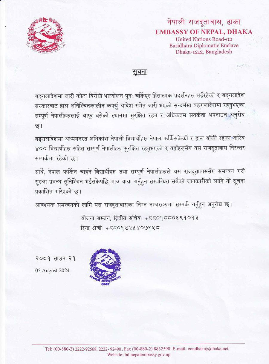 बंगलादेशमा आरक्षण विरोधी आन्दोलन पुनस् चर्किएर हिंसात्मक बन्न थालेपछि ढाकास्थित नेपाली राजदूतावासले त्यहाँ रहेका नेपाली विद्यार्थीलाई सतर्कता अपनाउन सूचना जारी गरेको छ । दूतावासले सोमबार एक सूचना जारी गरेर नेपाली विद्यार्थीलाई आफू बसेको ठाउँमा सुरक्षित रहन अनुरोध गरेको हो ।