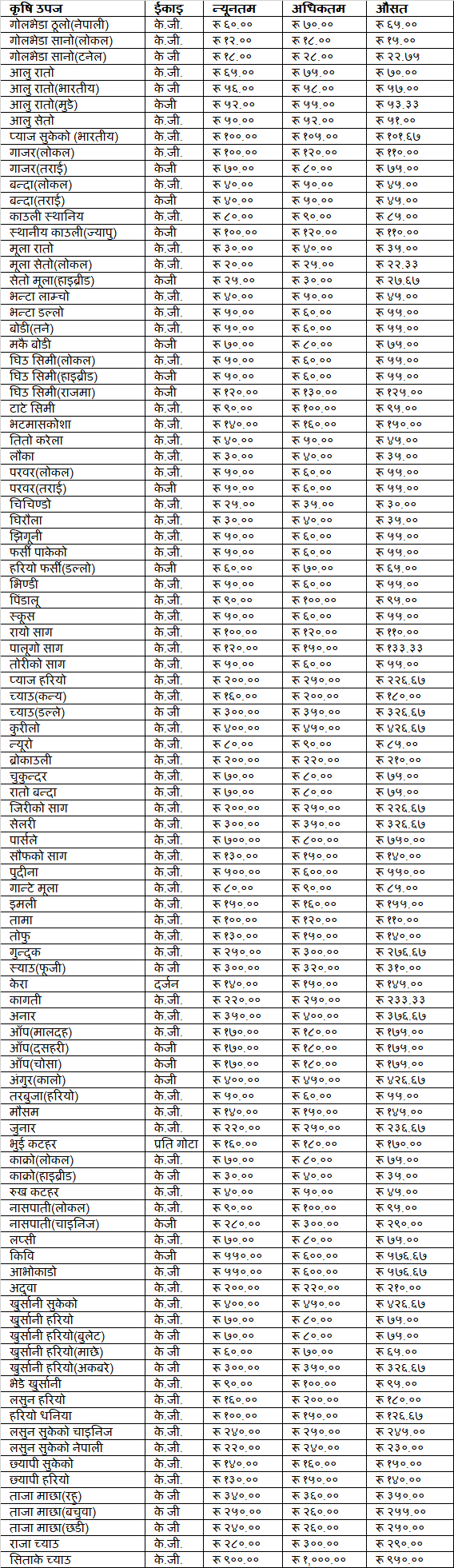 स्थानीय काउली प्रतिकेजी ८५ रुपैयाँ, स्थानीय काउली (ज्यापु) ११० रुपैयाँ, रातो मूला, हाइब्रीड काक्रो ३५ रुपैयाँ, लाम्चो भन्टा, तने बोडी, तोरीको साग, भिण्डी, पाकेको फर्सी, झिगुनी, तराई परवर र घिउ सिमी प्रतिकेजी ५५ रुपैयाँ, राजमा सिमी १२५ रुपैयाँ, भटमासकोशा १५० रुपैयाँ, चिचिण्डो ३० रुपैयाँ, पिंडालू ९५ रुपैयाँ, रायोको साग ११० रुपैयाँ, पालूगो साग १३३ रुपैयाँ ३३ पैसा, कन्य च्याउ १८० रुपैयाँ, डल्ले च्याउ ३२६ रुपैयाँ ६७ पैसा, कुरीलो ४२६ रुपैयाँ ६७ पैसा, न्यूरो ८५ रुपैयाँ, ब्रोकाउली २१० रुपैयाँ, जिरीको साग २२६ रुपैयाँ ६७ पैसा र पार्सले ७५० रुपैयाँ पर्नेछ ।