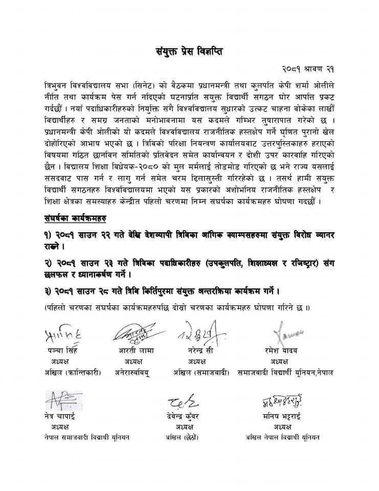 त्रिभुवन विश्वविद्यालय सभा (सिनेट) को बैठकमा विश्वविद्यालयका कुलपतिसमेत रहेका प्रधानमन्त्री ओलीले नीति तथा कार्यक्रम प्रस्तुत गर्न नदिएर राजनीतिक हस्तक्षेप गरेको ती विद्यार्थी संगठनको निष्कर्ष छ । विद्यार्थीहरूले क्याम्पसको गेटमा प्लेकार्ड प्रदर्शन पनि गरेका छन् । केन्द्रीयस्तरबाट तय गरिएको कार्यक्रम अनुसार अखिल क्रान्तिकारीलगायतका विद्यार्थीले देशव्यापी रूपमा मङ्गलबार त्रिविका आंगिक क्याम्पसहरूमा संयुक्त विरोध ब्यानर राखेको हो । विराटनगरको महेन्द्र मोरङ आदर्श बहुमुखी क्याम्पसको गेटमा प्रधानमन्त्री ओलीले नीति तथा कार्यक्रम रोकेर विश्वविद्यालयको समग्र उन्नति एवं प्रगतिमा ‘कु’ गरेको आरोप लगाइएको छ ।