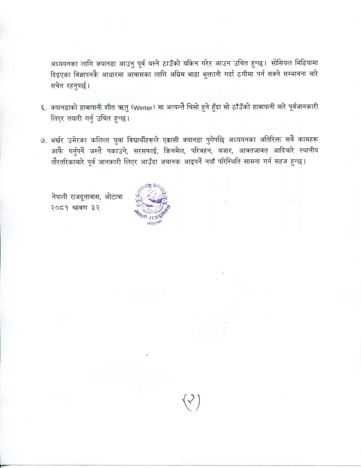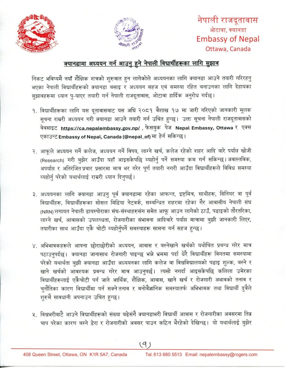 क्यानडाको अटवास्थित नेपाली राजदूतावासले क्यानडा जाने तयारीमा रहेका विद्यार्थीका लागि सुझाव दिएको छ।